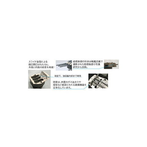 接着剤不要の「スナップフィット」を採用し、成型色は「呉海軍工廠色」を模した灰色、砲身部防水キャンバスは白色としています。 支筒にあたる部品は、クリアー成型の展示用ケーシングとしており、組み立て完成後も給弾・給薬室の様子が見てとれます。 砲塔天蓋には増設機銃座と機銃を再現でき、機銃も俯仰が可能な設計です。 昭和20年4月の天一号作戦時をイメージする増設機銃付き砲塔2基、機銃無し1基の組み合わせ。