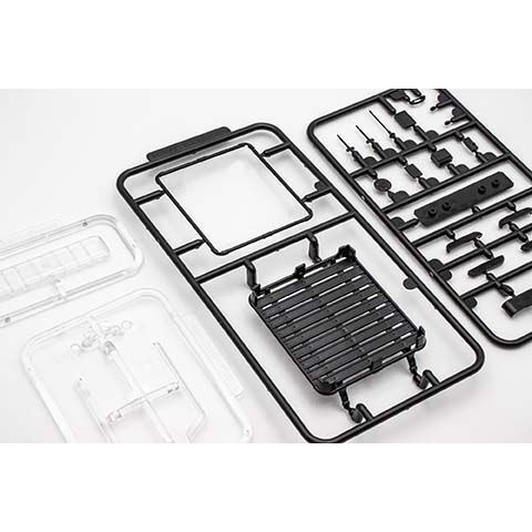 パーツカラーはピンク下地の立ち上げで赤塗装、直に赤塗装を考慮したホワイト ボディとルーフは別パーツ構成で、それぞれのプラカラーはホワイト ボディはスライド金型によるボックス形状で、スクエアスタイルを的確に再現 ドアパネルなど凹モールドは塗装スミ入れにも対応できるようメリハリある深さで表現。