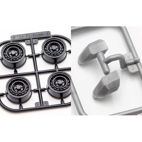 フロントタイヤは完成後もステアが可能、飾る際のステアポージングに自由度があります ホイールはベースグレード標準装備の17x7 1/2 Jスチールホイールを装備 ホイールパーツはブラックの着色済み成形色 タイヤはFJクルーザー専用のパーツでゴム素材でリアルな質感 スペアタイヤはホイールカバー付で再現