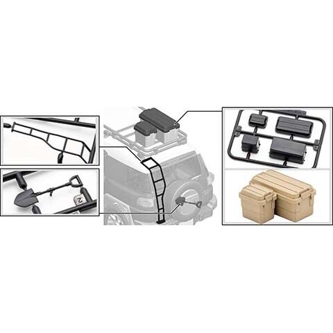 車両へのアクセサリーおよび積載物パーツが付属 ルーフキャリアへの積載が似合うキャリアボックス、大・小サイズ各1個が付属 背面のラダー、スペアタイヤ上に取り付ける形のシャベルが各1個ずつ付属 成形色はいずれもブラック