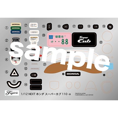 スーパーカブの特徴でもあるレッグシールド内側のフックは手軽にシールで、または接着式のボーナスパーツで選択表現。 スタンドは別パーツ化のうえ可動式。駐輪状態とすることも可能です。 サイドスタンドは別パーツ化のうえ可動。ボディを傾けて駐車状態にすることが可能。 シートは色調と同じ部分で分割した2ピース構造、跳ね上げが可能な可動式。 シートを開状態としたときの給油口フラットを再現しています。 燃料タンクの両サイドにあるネームデカールは金属感あるホイールシールを用意。