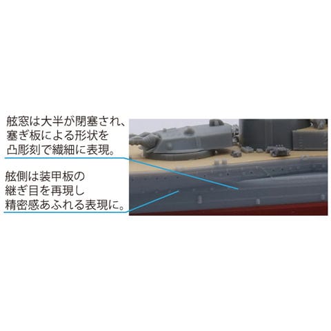 艦体は、舷側は装甲板の継ぎ目を再現し精密感あふれる表現に。 舷窓は大半が閉塞され、塞ぎ板による形状を凸彫刻で繊細に表現。