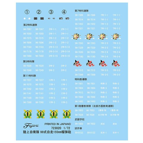 デカールには国内配備されている各隊配備された車両を均等に収録。 車両番号はすべて実在のもので、所属部隊表記との組み合わせも説明書に記載があり調査不要。 収録部隊は「特教-3」「2特」「5特」「7特」「11特」「武校」など。