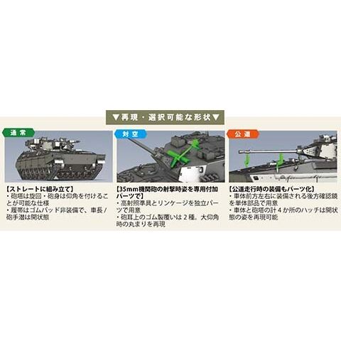 天面と左右側面は一体化されたスライド金型を起用したパーツ設計 35ミリ機関砲の砲身はフラッシュハイダと砲身を一体化した部品構造 砲身は俯仰角が可能 砲塔底部は換気装置給気口を再現 主砲基部(砲塔前面)は上下で分割したパーツ 主砲身右側の誘導弾検知器は、「覆いが開いた発射態勢」と閉鎖した状態」が選択可能 砲塔バスケットは底部と側壁の部品2点で構成 車長ハッチ・砲手ハッチは砲塔とは別パーツ化、「開/閉」どちらかの状態を選択可能 車長用照準潜望鏡および砲手用照準潜望鏡は防弾板を開いた状態を再現 防眩シャッターは専用パーツとデカールを組み合わせて使用することで再現可能 重MAT(79式対舟艇対戦車誘導弾)発射機は組立てやすさを考慮したL字型パーツ 前部扉は発射時の「開」、通常時の「閉」のそれぞれパーツを用意、選択可能 発射機は仰角を変更することが可能 4連の発煙発射機は砲塔から独立した単独パーツで用意 アンテナマストは角度を変更可能な仕様 車長用ペリスコープは透明成形パーツが付属 レーザー検知器は砲塔とは別パーツ化、検知部の窓を彫刻で再現 高射照準具・リンケージは装着の「有・無」を選択可能