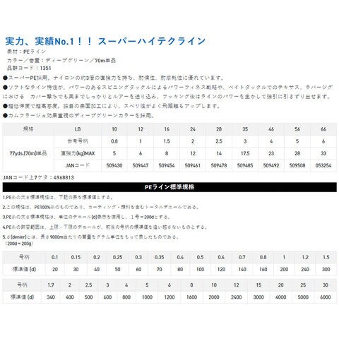 スーパーPE採用。ナイロンの約3倍の直強力を持ち、耐候性、耐摩耗性に優れています。