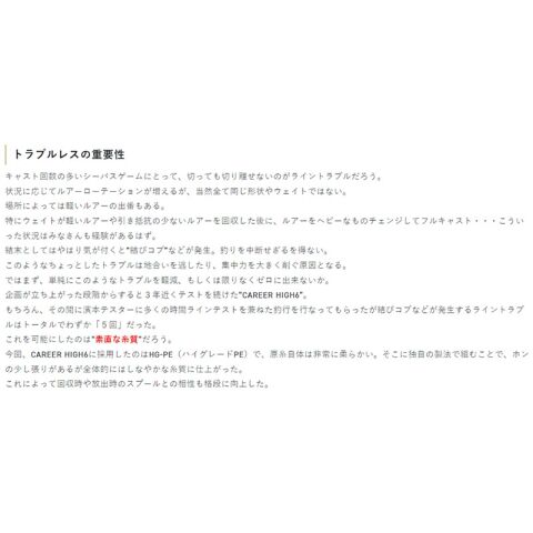 また、「単純にランカーシーバスとの真っ向勝負」も“不意に食らう突っ込み”や、“長時間の耐久戦”を想定して、HG(ハイグレード)PE素材を採用。