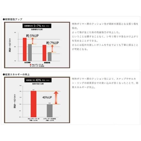 ◆ゴムのように形成された特殊ポリマー層は、ハードな岩礁帯などのストラクチャーとの接触時にクッションとなることでコスレによるキズを吸収し、ラインブレイクを防ぎます。