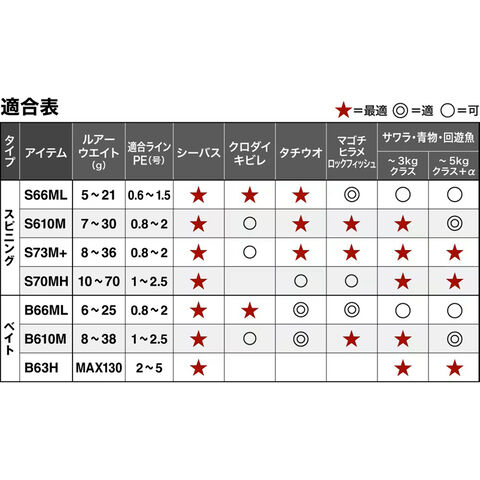 いずれも3kg~5kgオーバーの回遊魚にも対応可能なパワーを秘めながら、小型ルアーをテクニカルに操るミディアムライトクラスからビッグベイト対応のヘビークラスまで目的に応じたスペックをバランスよく展開。