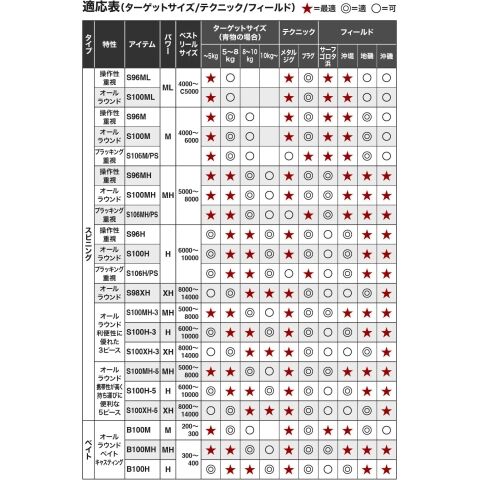 30g前後から100gを超えるメタルジグ&プラグに適応するMLからXHパワーまでの豊富なラインナップ。加えて、利便性に優れた3ピースモデルも展開。