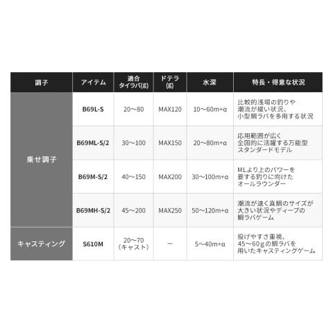 鯛ラバ:バーチカル40~150g/ドテラMAX200g、水深30~100m+α