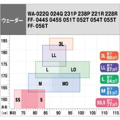 サイズ目安 身長 胴囲 股下 SS 155~163cm 70~80cm 77cmまで S 155~163cm 73~83cm 77cmまで M 162~170cm 76~86cm 81cmまで MO 162~170cm 86~98cm 81cmまで L 168~175cm 79~89cm 84cmまで LO 168~175cm 89~102cm 84cmまで LL 173~182cm 82~92cm 87cmまで 3L 180~185cm 85~95cm 90cmまで 足サイズ 目安 SS 23.0~23.5cm S 24.0~24.5cm M、MO 25.0~25.5cm L、LO 25.5~26.0cm LL 26.5~27.0cm 3L 27.5~28.5cm