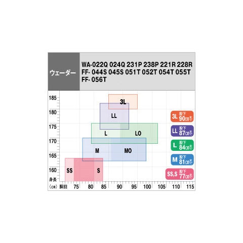 ・ブーツ部:PVC ソール:PVCサイズ目安 身長 胴囲 股下 SS 155~163cm 70~80cm 77cmまで S 155~163cm 73~83cm 77cmまで M 162~170cm 76~86cm 81cmまで L 168~175cm 79~89cm 84cmまで LL 173~182cm 82~92cm 87cmまで 3L 180~185cm 85~95cm 90cmまで 足サイズ 目安 SS 23.0~23.5cm S 24.0~24.5cm M 25.0~25.5cm L 25.5~26.0cm LL 26.5~27.0cm 3L 27.5~28.5cm