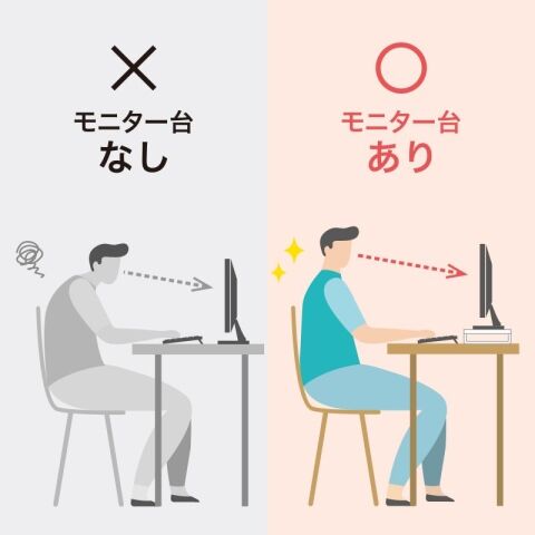 ◆モニタの高さを上げる事で目線を高くして作業時の姿勢の改善に役立ちます。