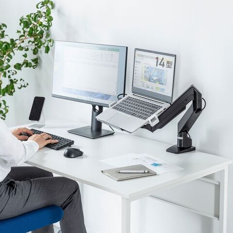 モニターアームと組み合わせることでノートパソコンを浮かせて使えるので、デスクスペースを広く有効活用できます。