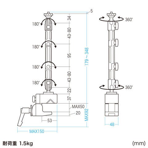 支柱・天板に挟むだけで簡単にカメラを設置できるクランプ式のカメラアームです。