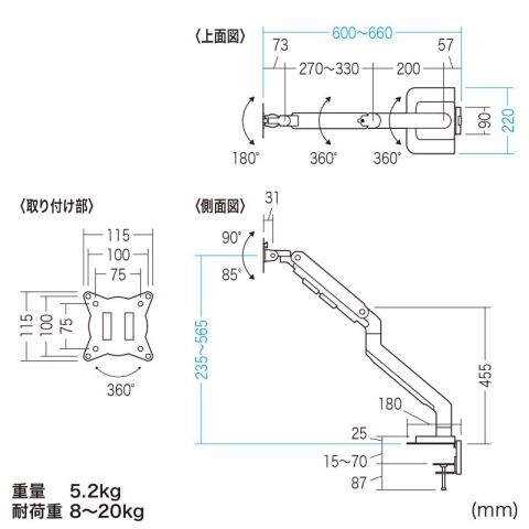 - 対応機器:VESA75×75、100×100に対応する8~20kgのモニター