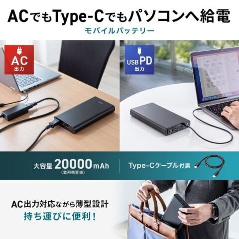 ノートパソコンへの給電に最適な、ACコンセントプラグを直接挿せるAC出力付きモバイルバッテリー。USB PD給電にも対応。