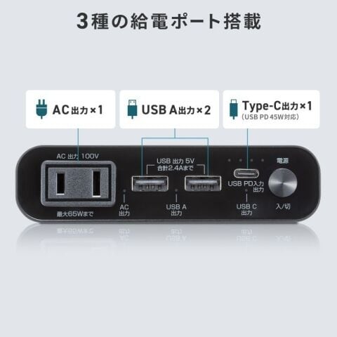 AC×1、USB A×2、Type-C×1と3種の給電ポートを搭載しており、様々な機器に対応します。