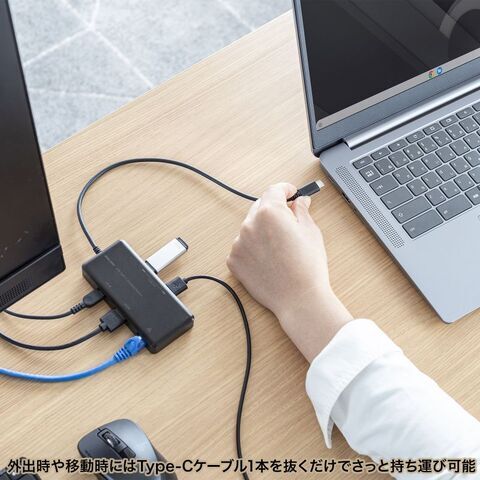 ◆Type-Cケーブル1本の接続で、大画面ディスプレイとUSBデバイスで快適に操作し、外出や会議など移動時には Type-Cケーブル1本を抜くだけでさっと持ち運ぶことができます。