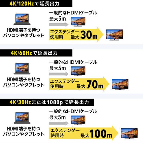 最大4K/120Hz解像度に対応し、4K/120Hzの場合は最大30mまで、4K/60Hzの場合は最大70mまで延長できます。