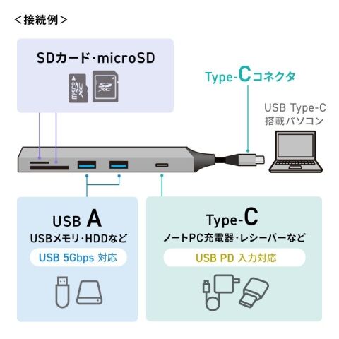 ノートパソコンやタブレットのType-Cポートに接続するだけで、USB機器を複数接続できます。