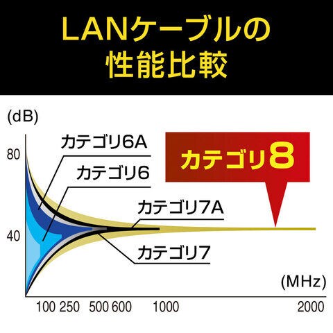 ◆伝送帯域2000MHzをクリア。エンハンスドカテゴリ5の20倍、カテゴリ6の8倍の伝送帯域である2000MHzをクリアします。帯域が広いほど高速伝送が可能になり、データエラー防止効果があります。