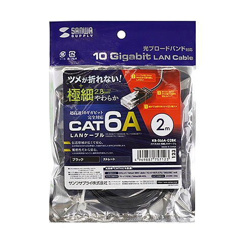 サンワサプライ カテゴリ6A極細LANケーブル(ブラック・2m) KB-SL6A-02BK 【返品種別A】
