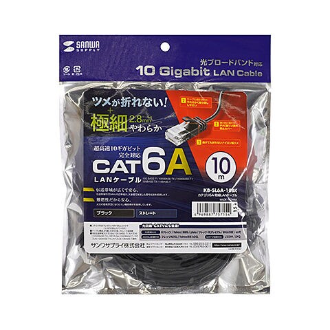 サンワサプライ カテゴリ6A極細LANケーブル(ブラック・10m) KB-SL6A-10BK 【返品種別A】