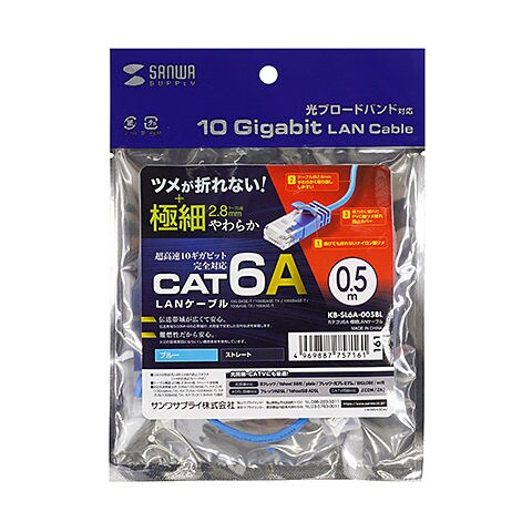 サンワサプライ カテゴリ6A極細LANケーブル(ブルー・0.5m) KB-SL6A-005BL 【返品種別A】