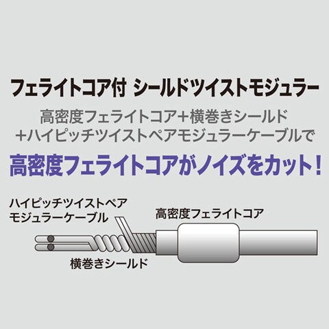 ◆ノイズに強いシールド付きツイストモジュラーケーブルに一体成形の高密度フェライトコアを取り付けており、ADSL・高速通信に最適です。