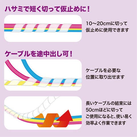◆ケーブルに巻き付け、束ねることが可能です。ハサミやカッターナイフで必要な長さに簡単に切ることができます。