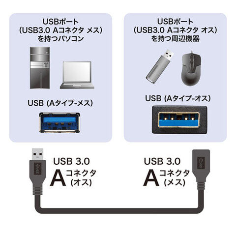 - コネクタ形状:USB3.0 Aコネクタオス-USB3.0 Aコネクタメス(USB Type A - USB Type A)または