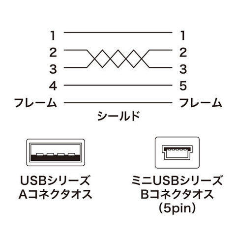- コネクタ形状:USB Aコネクタオス-USB ミニBコネクタ(5pin)オス