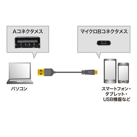 ◆USB Aコネクタのパソコンと、マイクロUSBコネクタ(マイクロB)を持つスマートフォン・USB機器を接続できます。
