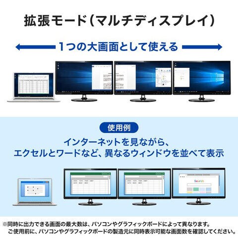 3台のディスプレイへの拡張出力に対応しており、ノートパソコンの画面を含めた場合、最大4画面への拡張出力(4K/30Hz×3+ノートPC画面)が可能です。