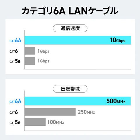 通信速度は10Gbps、伝送帯域はカテゴリ5eの5.0倍、カテゴリ6の2倍の500MHzをサポート。