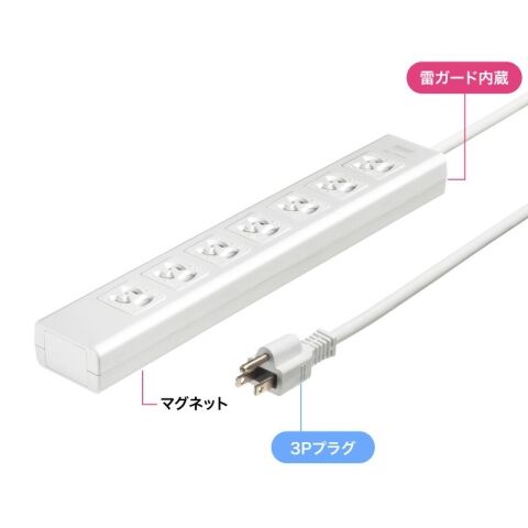 「雷ガード」を内蔵しており、電源から侵入してくるノイズや雷サージから家電製品などの機器を守ります。