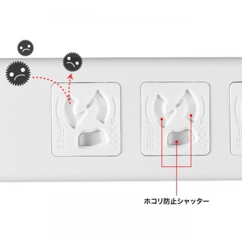 すべての差込口にホコリ防止シャッターが付いている、抜け止め仕様の3Pタップです。