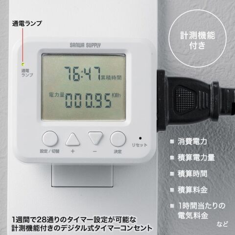 曜日ごとにタイマー設定が可能で、店舗などで営業時間のみONにしたい機器にも最適です。