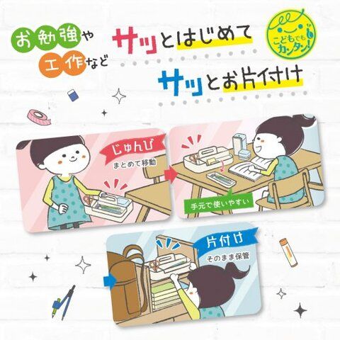 ◆勉強セットや工作セットなど、必要なものまとめて整理整頓! 片手で家じゅう持ち運べるから、サッとはじめてサッとお片付け!