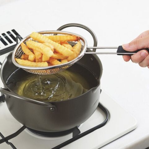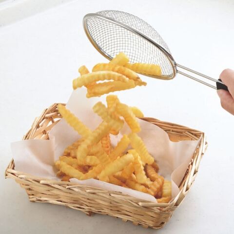 ◆揚げた料理をまとめてすくえる油きりザル。