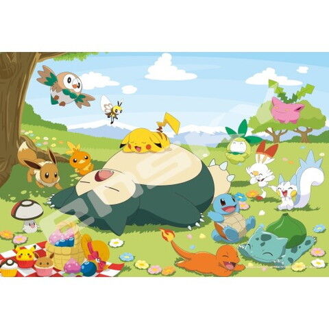 ぽかぽかお天気の青空が広がる野原で、ポケモンたちがのんびりピクニックを楽しんでいるイラストのジグソーです。