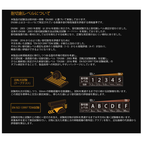 - 【耐切創レベル】:回転刃試験 レベル4/EN ISO 13997 TDM試験 C