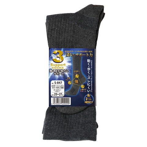 おたふく手袋 3サポートソックスクルー 先丸 2足組(ダークグレー×グレー・サイズ:25~27cm) S-847-GRY 【返品種別B】