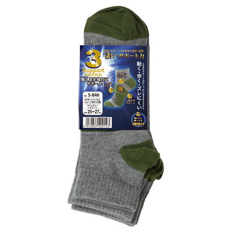 おたふく手袋 3サポートソックスショート 先丸 2足組(ライトグレー×グリーン・サイズ:25~27cm) S-846-GG(オタフク) 【返品種別B】