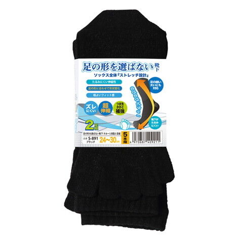 おたふく手袋 足の形を選ばない靴下クルー 5本指 2足組(ブラック・サイズ:24~30cm) S-891-BLK 【返品種別B】