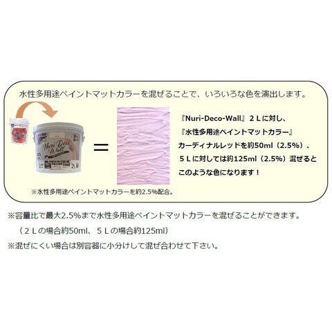 ◆容量比で最大 2.5% まで水性多用途ペイントマットカラーを混ぜることができます。(2Lの場合約50ml、5Lの場合約125ml)