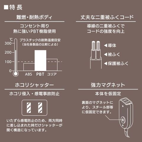 ◆コンセント周りに熱に強いPBT樹脂使用、難燃・耐熱ボディ