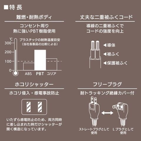 ◆コンセント周りに熱に強いPBT樹脂使用、難燃・耐熱ボディ