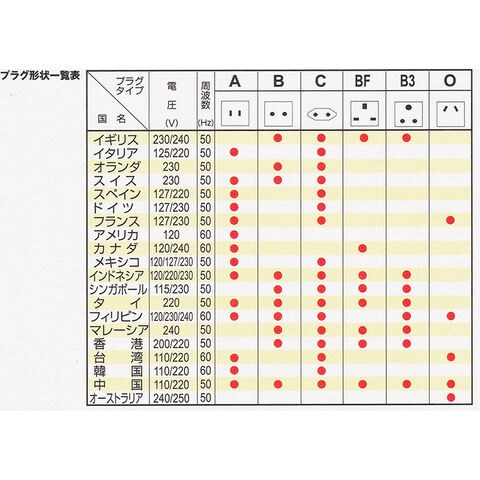 ※日本の電源コンセントの形状は全国共通のタイプですが、国によってはエリアや施設(建物)によって形状が異なり、いくつかのタイプが混在している所があります。お出かけの前に、現地の規格を確認されることをおすすめします。